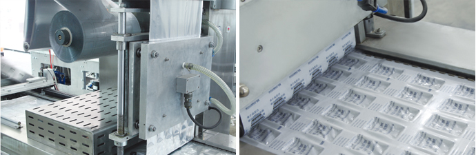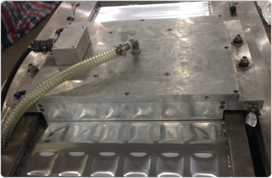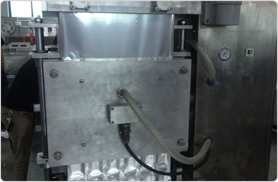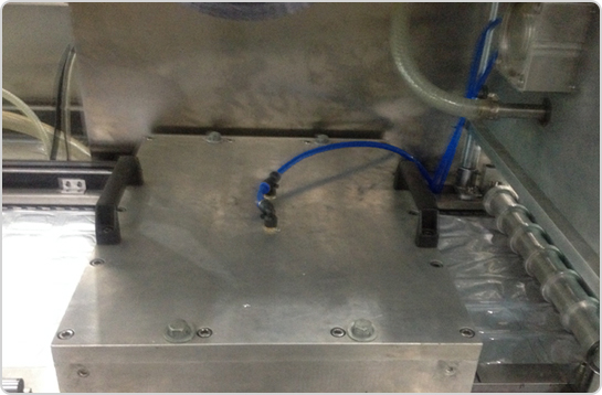 4、設(shè)備中部(封口和真空區(qū)域) 由封口模具和上加熱模具,設(shè)備通過步進(jìn)到達(dá)封口真空區(qū)域,下膜模具通過氣缸上升、壓緊上加熱模具,再通過真空管路進(jìn)行抽真空,最后完成封口。 |