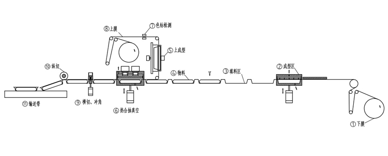 2、設(shè)備前端(上)(成型區(qū)域) 由成型模具和上加熱模具組成,使下膜成型成所設(shè)定形狀。 |